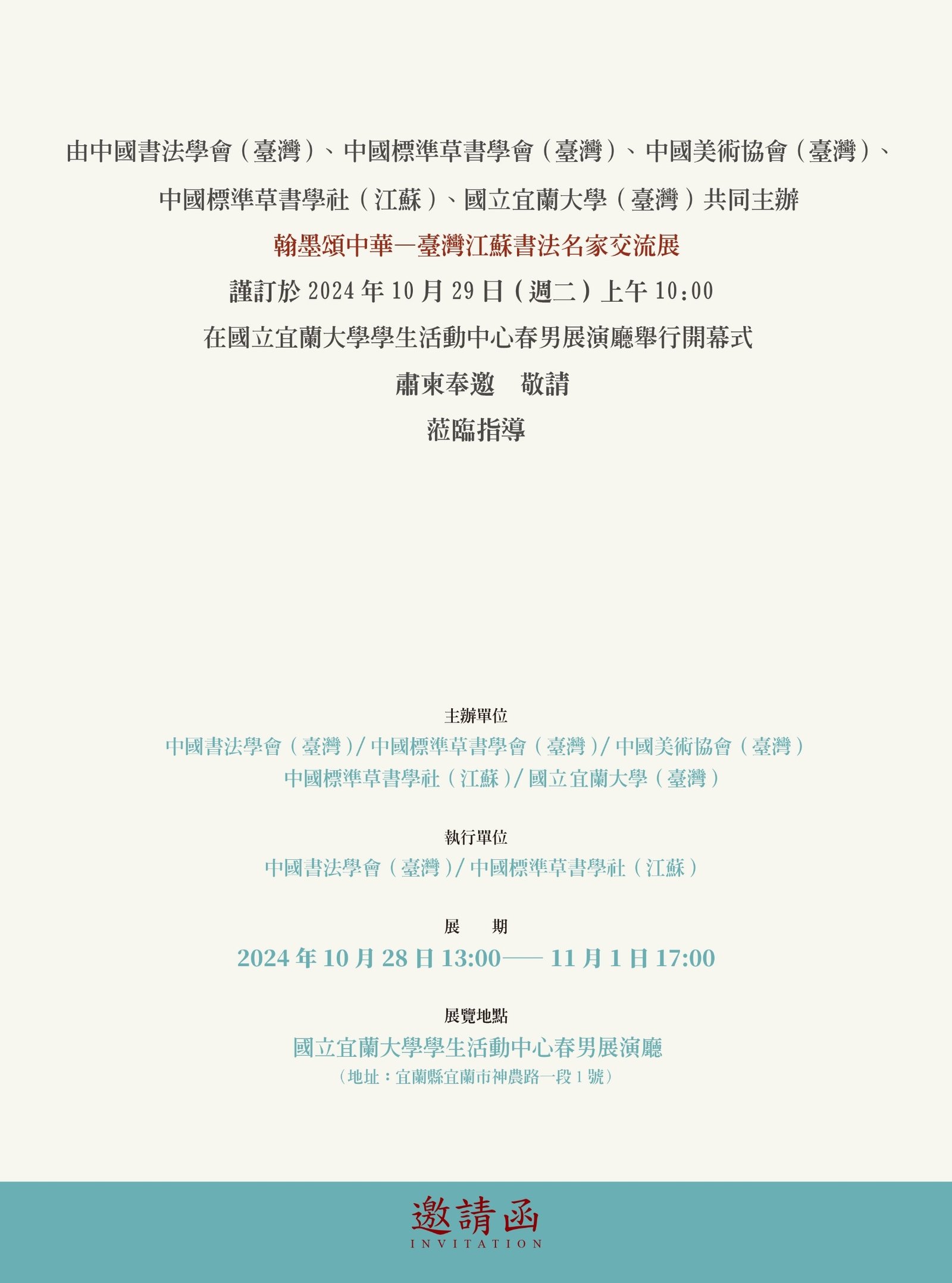 由中國書法學會(臺灣)、中國標準草書學會(臺灣)及中國美術協會(臺灣)與中國標準草書學社(江蘇)、國立宜蘭大學(臺灣)共同主辦。