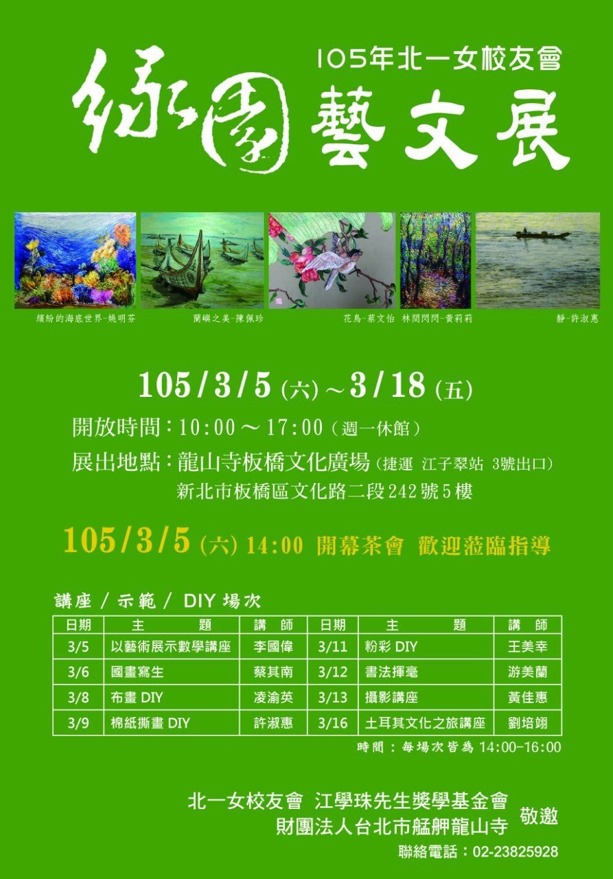 2016 北一女校友會-緣園藝文展 新聞 03 三月 2016 列印 Email 展覽日期:2016.3.5(六)~3.18(五)開放時間:AM10:00~PM17:00(週一休館)地點:龍山寺板橋文化廣場 (新北市板橋區文化路2段242號5樓) 閱讀全文...